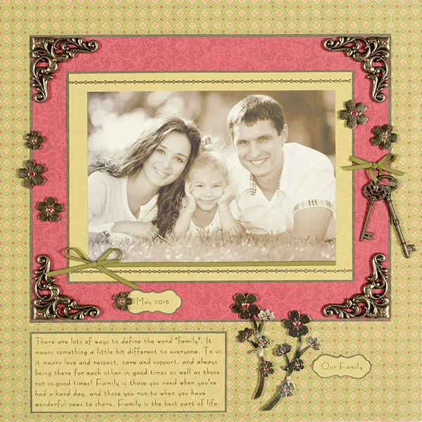 You will use Roses & Lace green/pink tiles paper as your background. Mat a 7”x5” photo on Roses & Lace light green lace paper with 1/2” borders, then on Roses & Lace dark gray textured paper with 1/16” borders. Mat again on Roses & Lace dark pink lace paper with 1” borders, and Roses & Lace dark gray textured paper with 1/16” borders. Glue centered on the page, 1” from the top.