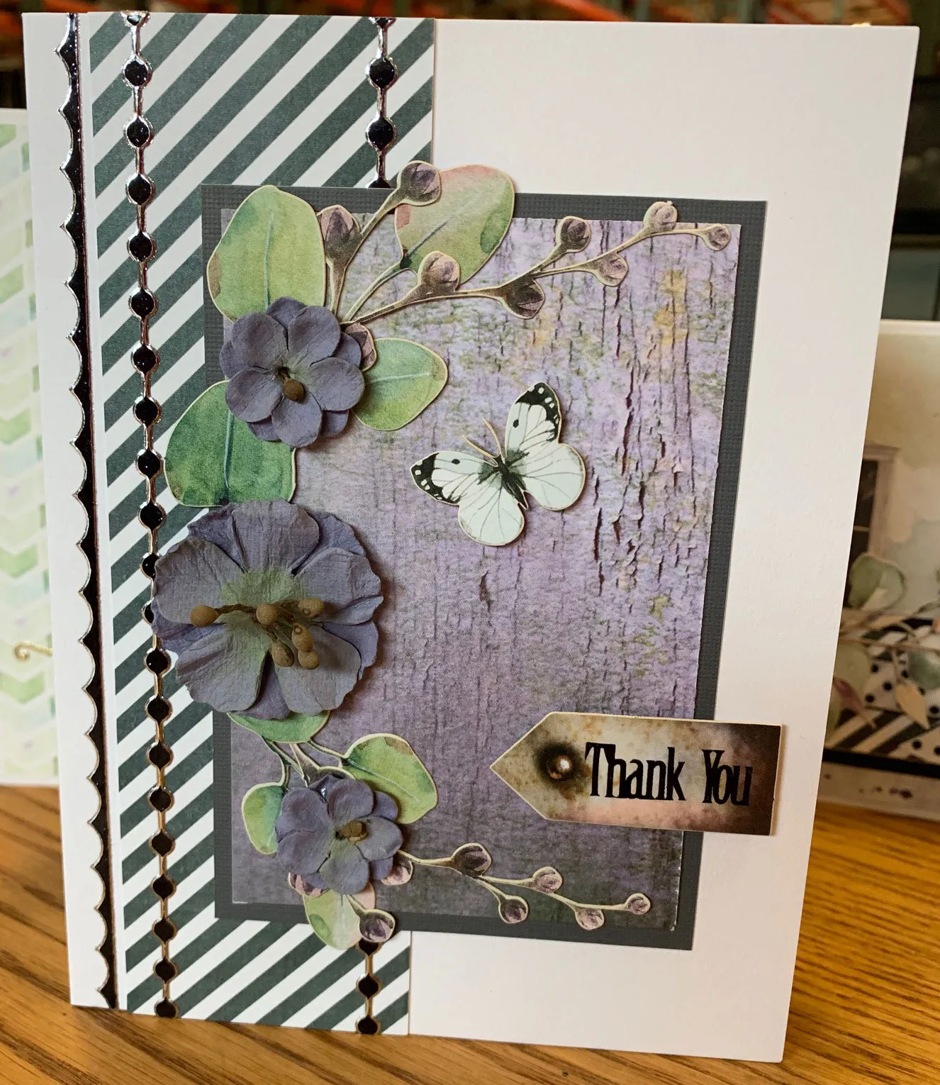Glue one 1½" and two 1" Blueberry flowers over the branches as shown. Place “thank you” Dazzles™ on the larger Serendipitous tag die-cut and foam tape it at the lower right as shown. Foam tape a 1" butterfly die-cut near the upper flower as shown.