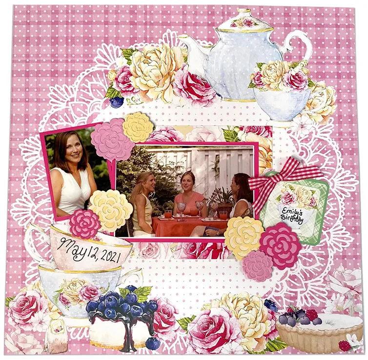 LeNae matted both photos on Teacups & Roses 12”x12” Solid Cardstock then matted one also on Teacups & Roses 12”x12” Patterned Cardstock. She used a Pen Knife to cut around the top teacup on the dotted Teacups & Roses Cardstock then inserted one photo under it and glued the other on top. She used the Corner Roses Cutting Dies with the Solid Cardstock to make the flowers then glued and foam taped them as shown. She added a bow from the Magenta/Dark Pink Ribbon Set and glued a cutout as shown. She used a black pen to personalize her page.