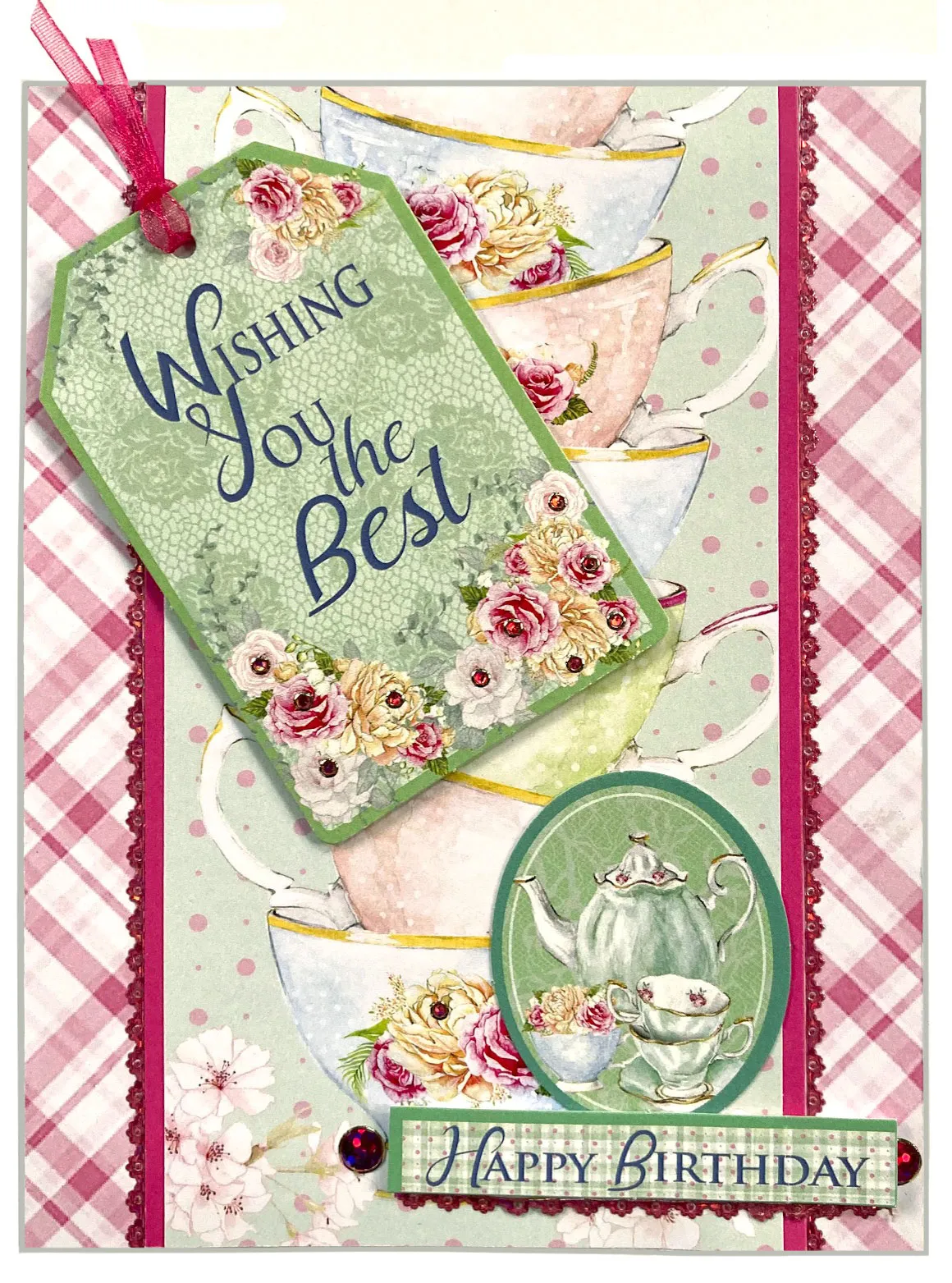 Debbie glued Teacups & Roses 12”x12” Patterned Cardstock to her 5”x6½” card. She matted 3 ½”x6 ½” teacups border on Teacups & Roses 12”x12” Solid Cardstock and glued it in the center. Glitter Thin Line Dazzles™ Stickers were placed on each side. She glued and foam taped 3 Die-Cuts as shown, added a ribbon from the Dark Pink Ribbon Set and Pink Jewel Dazzles™ stickers as shown.