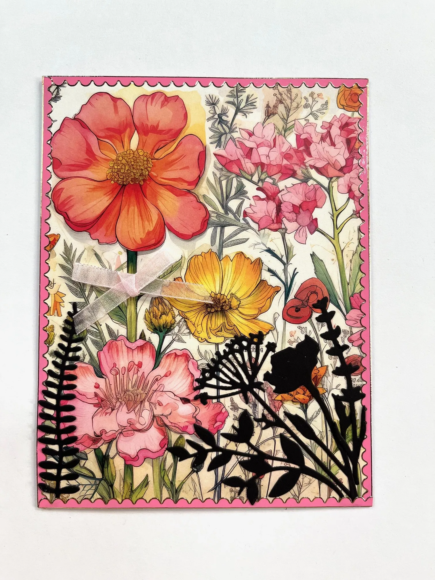 2. Cut one each of the Meadow Blooms Dies out of black cardstock. Glue to the card as shown going over the border Dazzles™. Tie a bow using the Light Pink Ribbon set and Zot™ along the stem of the left flower.