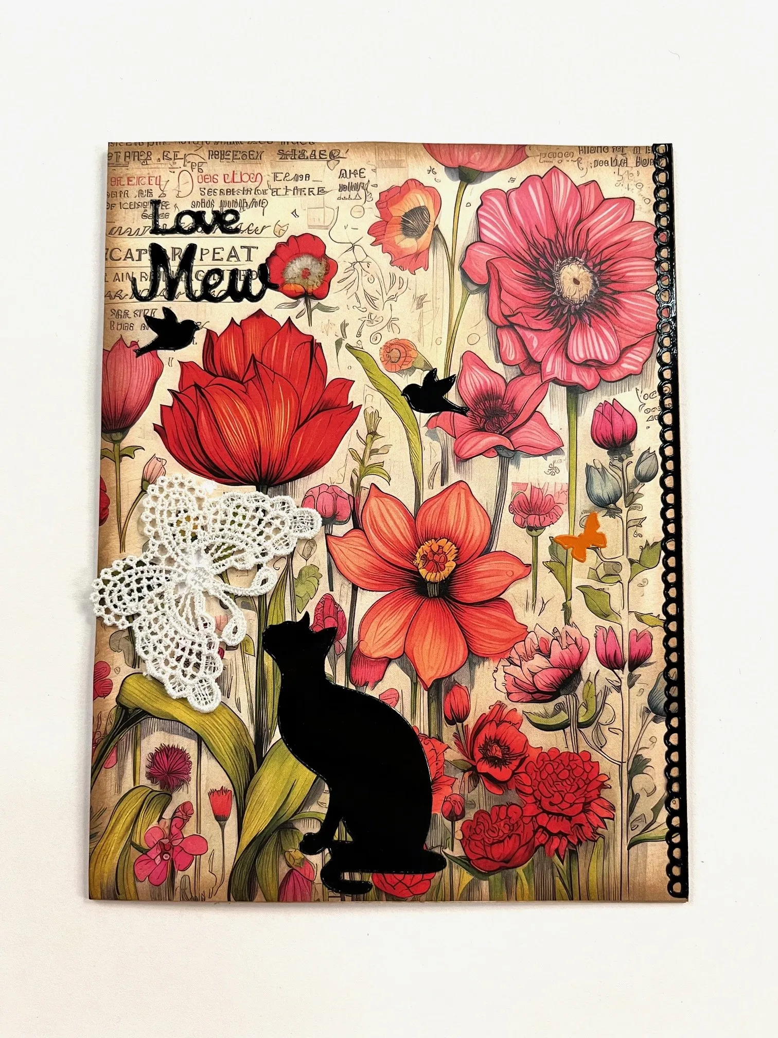 4. Place a brown, black and orange cat at the bottom. Place the brown border along the fold. Place “Just fur You” at the top. Place orange butterflies among the flowers.