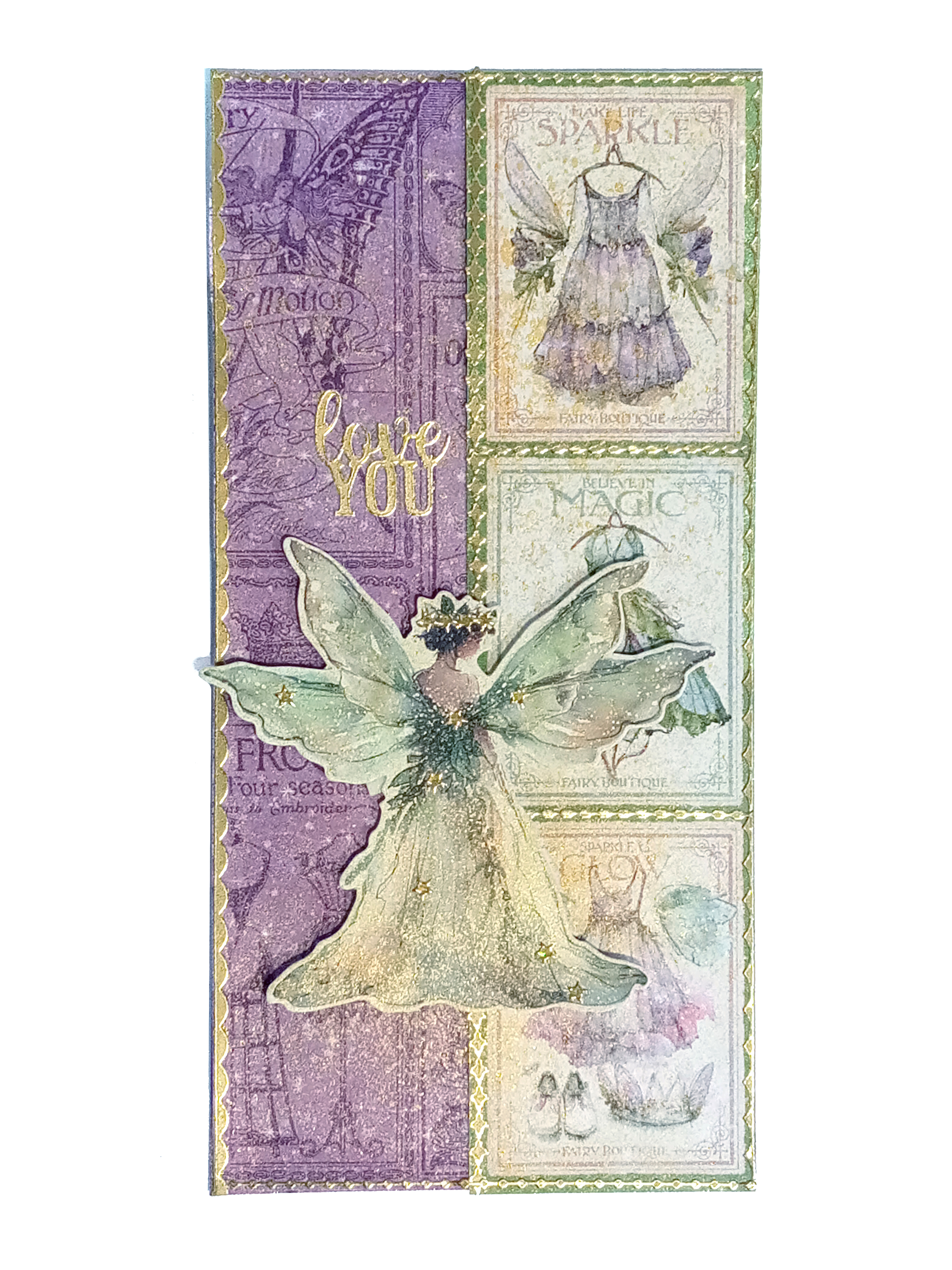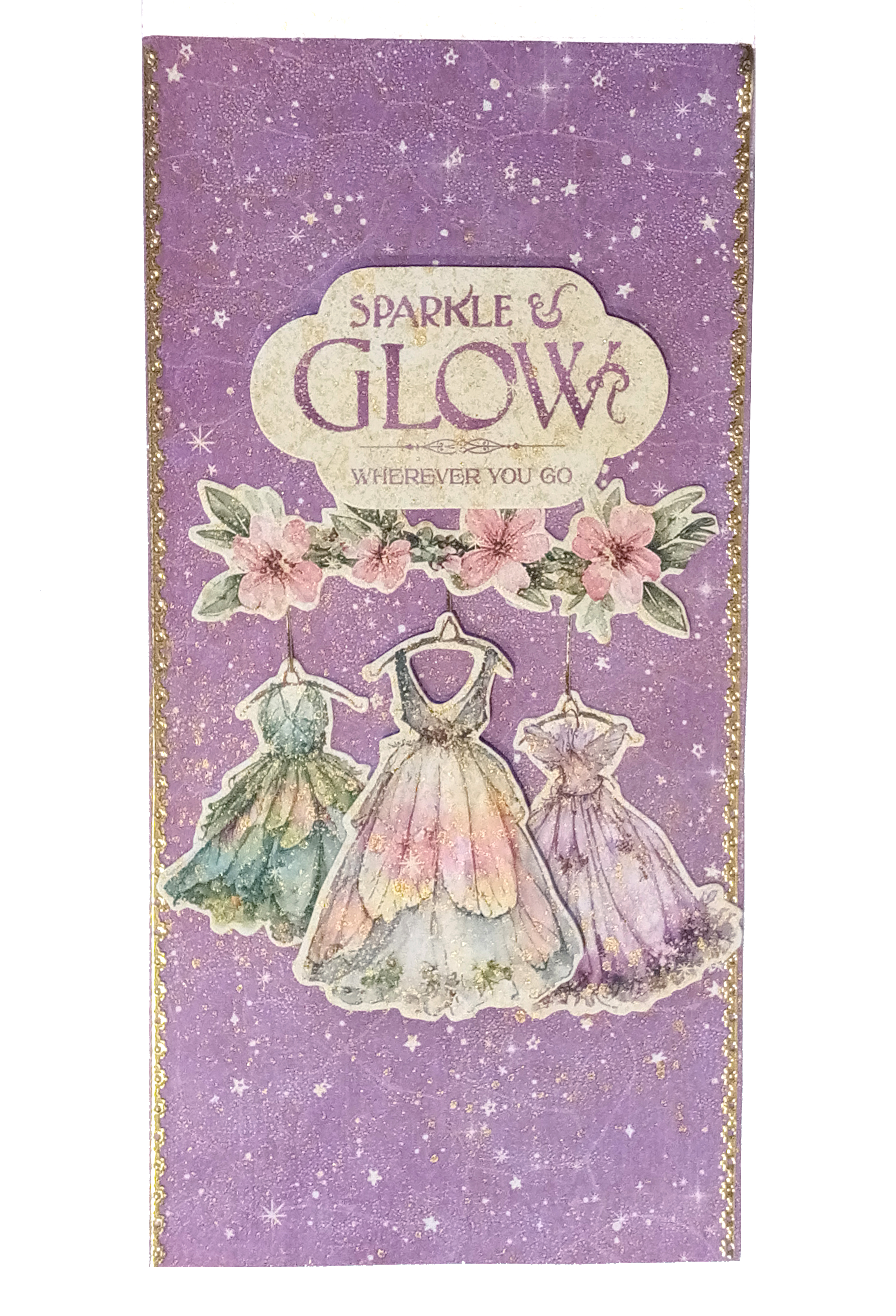 3. Inside: Cover with purple stars Fairy Boutique paper. Trim the pink flower spray to fit in the card and glue in place. Foam tape “Sparkle & Glow” at the top of the flowers. Glue two dress and foam tape a larger one as shown. Place gold straight Dazzles™ for the dresses to hang. Place gold thin line Dazzles™ on the long edges. Spray with Glimmer Mist.