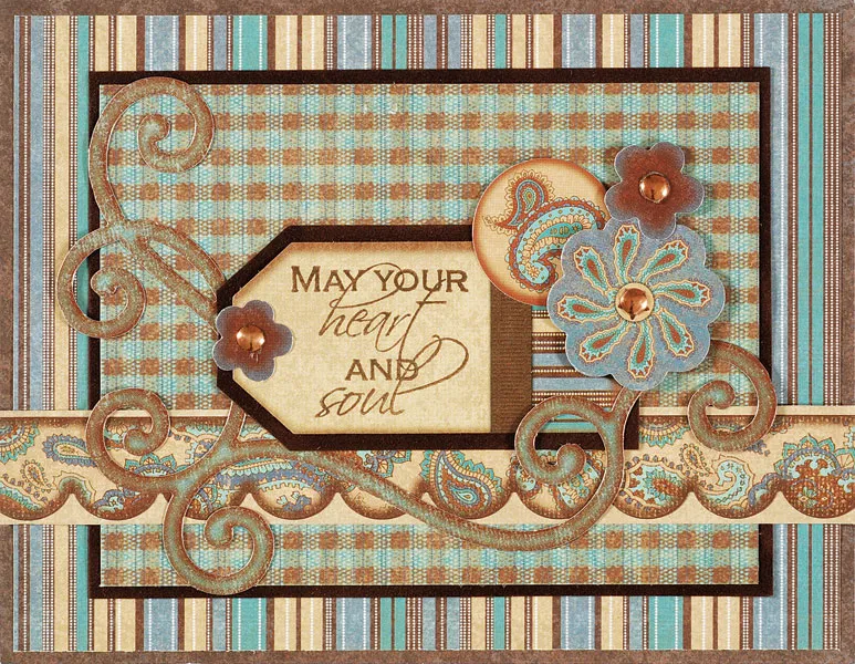 Cut 6½"x 7/8" Kyla’s Tapestry tan cardstock and place Kyla’s Tapestry scalloped border sticker across the center. Glue to the front, 1" from the bottom. Stamp “may your heart and soul” on the tan tag sticker, then mat on Kyla’s Tapestry brown cardstock with 1/16" borders.