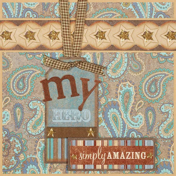 Remove the “simply amazing” die-cut, cut off the nibs, and foam tape overlapping the tag as shown. Place “my” Tapestry stickers on the tag above “hero&rdquo,; then place Dazzles™ stars as shown.