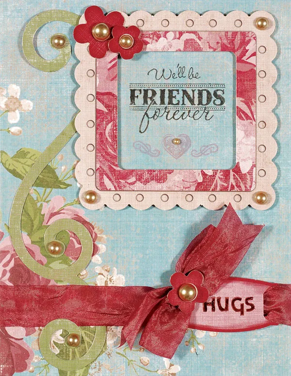 Punch out the Kyla’s Tapestry green swirl and pink frame die-cuts and cut off the nibs. Glue the swirl along the left edge, tucking it under the ribbon. Place the frame on the upper right and lightly draw the inner square onto the front. Remove the frame and stamp “We’ll be FRIENDS forever” with Brown ink and the heart with a swirl on each side with Pink ink as shown. Erase the lines and foam tape the frame over the greeting.