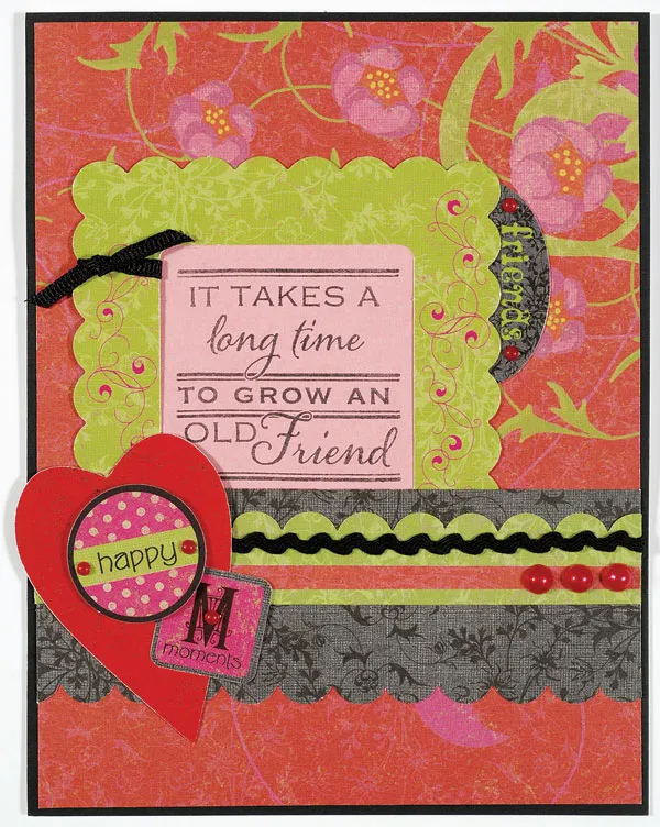 Punch out the Kyla’s Tapestry die-cuts shown and cut off the nibs. Glue the heart to the border’s left end, then glue “moments” and foam tape “happy” to the heart as shown. Slip the “friends” tab under the frame on the top right and glue, then place pearls as shown.