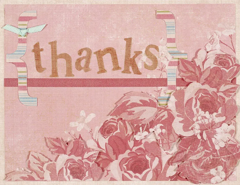 Punch out the two Kyla’s Tapestry pink striped bracket die-cuts and cut off the nibs. Glue one near the upper left corner, then place Kyla’s Tapestry “thanks” stickers to the right of it. Glue the second bracket as shown.