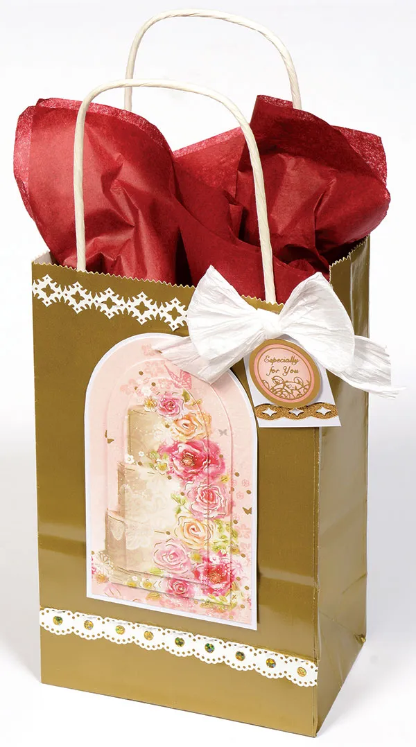Tag: Trace the smallest die-cut arch piece onto white cardstock and cut 2” from the bottom. Place a length of Gold Jewel Border Dazzles™ across the bottom. Foam tape the “Especially For You” circle die-cut to the tag center. Use a length of the white twine to make a bow and Zot to the top of the tag. Foam tape the tag to the top of the bag.