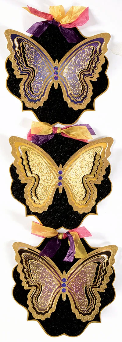 Place 2 Flip Flop Fasteners™ on the top and bottom of the middle shape. Punch out gold, purple and burgundy die-cut butterflies from Hunkydory Butterfly Wings Card Kit and fan the wings upward. Glue a butterfly to each shape. Embellish body centers with Purple Jewel Dazzles™.