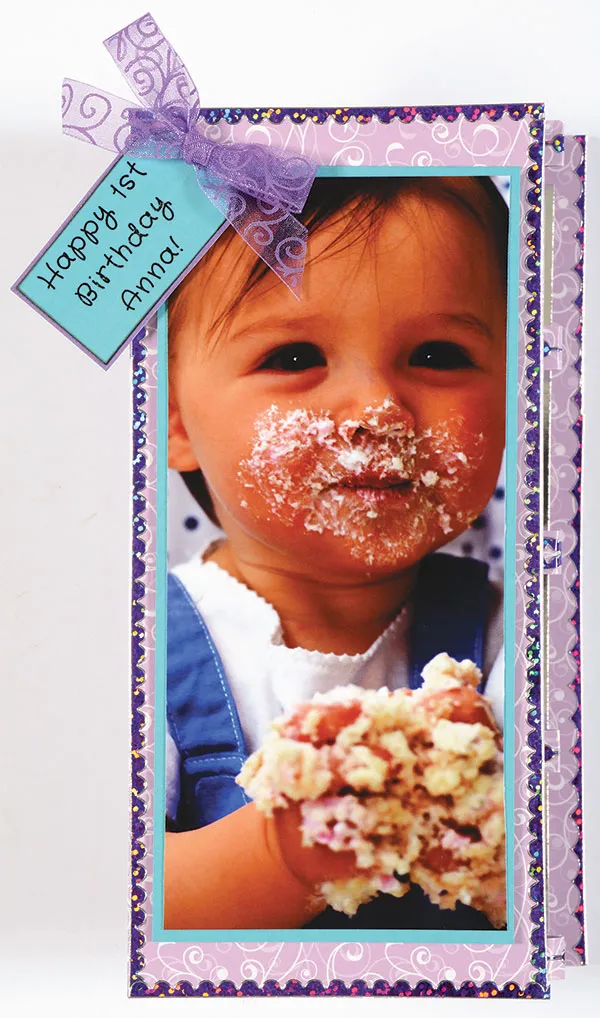 Follow the manufacturer’s instructions for folding the card background. Place Purple Jewel Border Dazzles™ around the outside edge of the card front, the back edge, and the pop-out narrow sections in the center.
