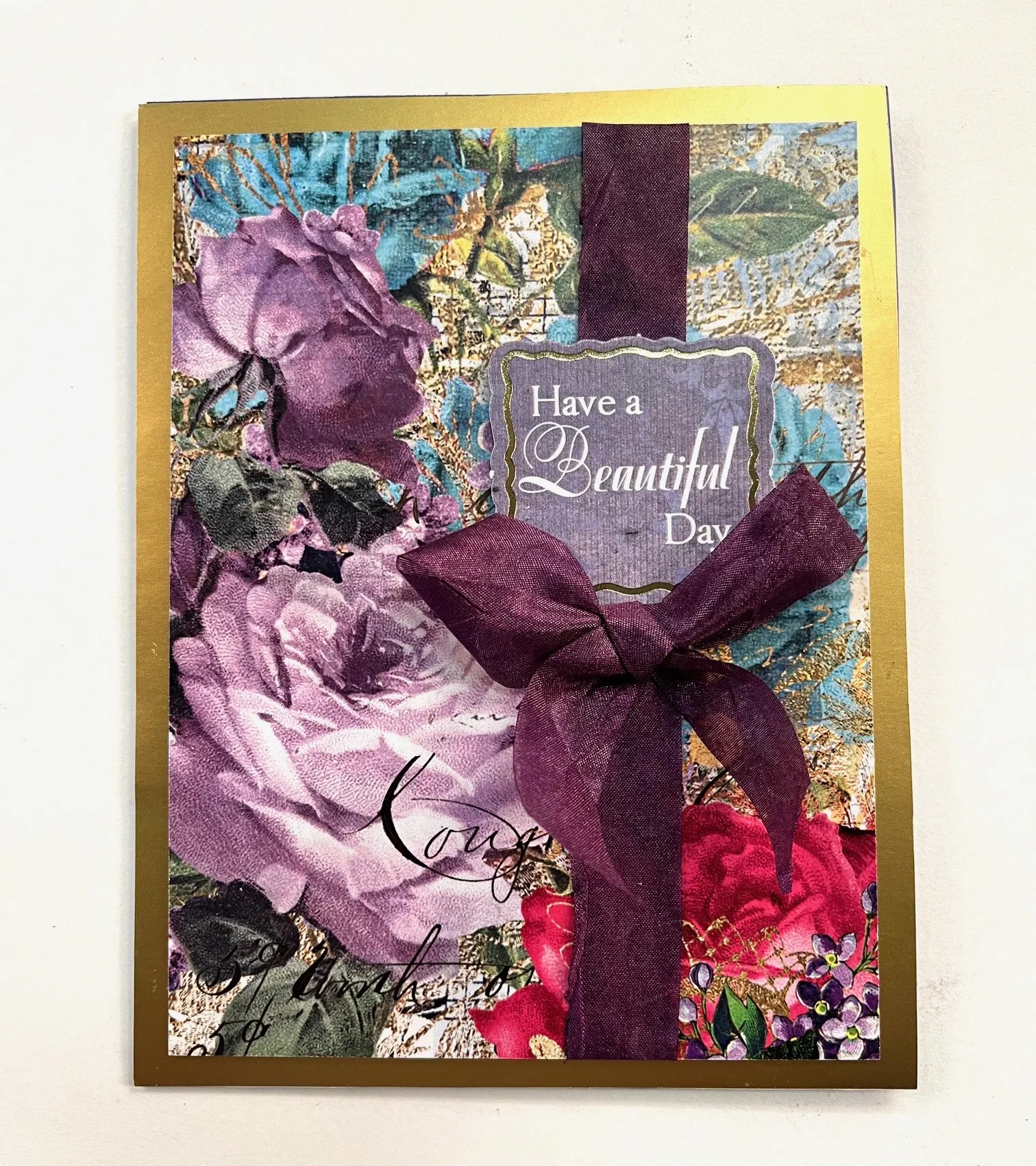 2. Foam tape “Have a Beautiful Day” Sentiment as shown. Zot™ a purple bow below the sentiment.