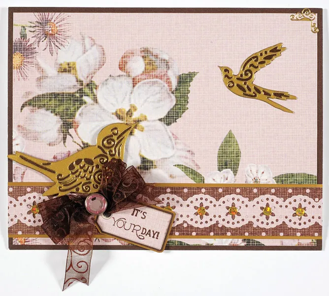 Make a 4-loop bow with brown ribbon and secure the center with a pink rhinestone brad. Glue to the strip near the left end. Place the Dazzles™ 2¾" bird and a 1¾" flying bird on brown glimmer paper and cut out. Foam tape the large bird perched on the brad and glue the small bird as shown.