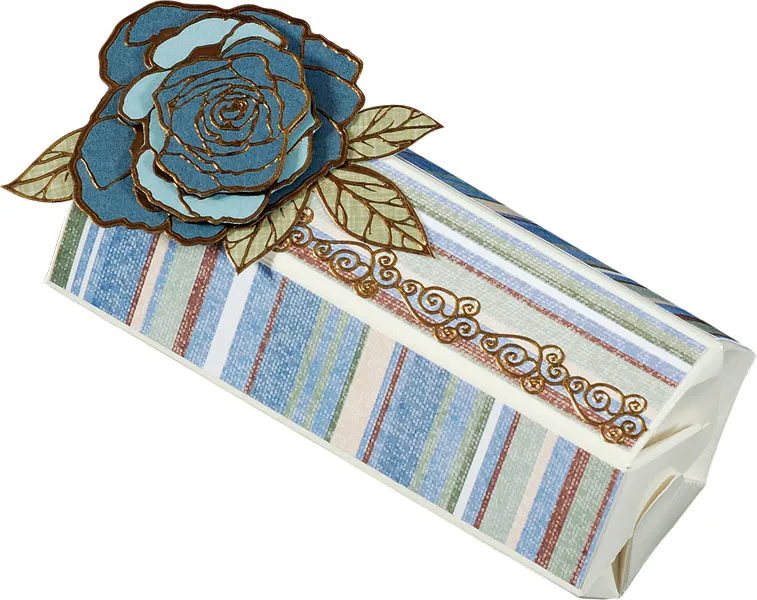Place the border along one edge of a horizontal-striped box panel. Glue the largest rose on the left end, then stack the remaining roses on top, placing foam tape between the layers. Glue the leaves tucked under the rose edges. Fold the flaps in on one end, fill the box, then fold the remaining flaps to close.