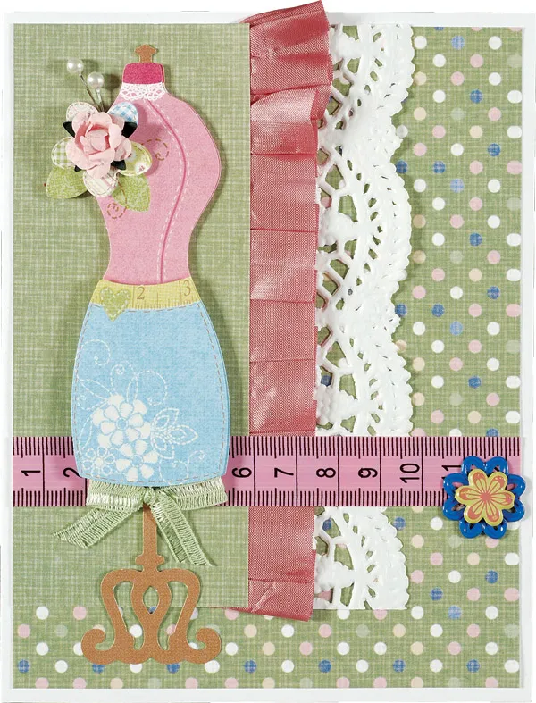 Cut 4¾" of the measuring tape and glue across the front, 1 7/8" from the bottom. Punch out and assemble the dress form papier tole following the package directions, placing foam tape between the layers. Tie a green fiber bow to the dress form base, then glue to the front as shown. Glue a paper rose to the flower center and insert the pins into the foam tape behind the flowers. Attach a cream flower brad to a blue mini Brad Buddy™ and glue as shown.