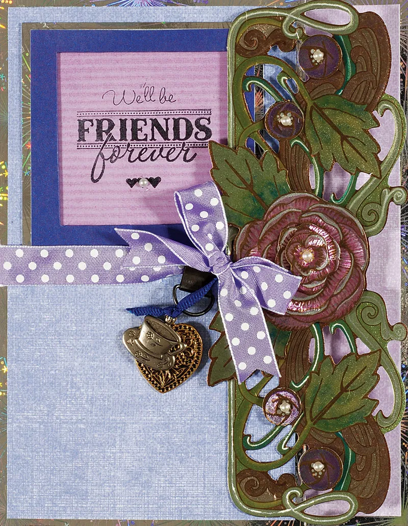 Cut a 2½" square of purple striped paper and stamp “We’ll always be FRIENDS” and three hearts in the center. Glue centered behind the frame, then mat on Silver Fireworks paper with 1/8" borders. Glue to the front, ¼" from the top, slipping it under the ribbon.