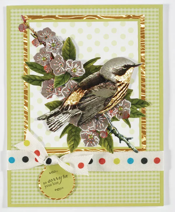 Cut 3½"x4" white/green dotted paper and mat on green paper with 1/16" borders. Mat on gold ripple paper with 1/8" borders, then glue to the front, 3/8" from the top. Follow the package directions to punch out and assemble the bird & branch papier tole design, placing foam tape between the layers. Glue to the dotted paper as shown.