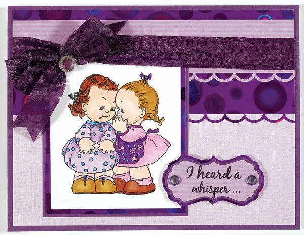 Use the template to trace and cut bracket Label B from purple striped paper. Stamp “I heard a whisper” on it. Mat on purple cardstock, then on purple circles paper with 1/16" borders each time. Foam tape to the front and add rhinestones as shown.
