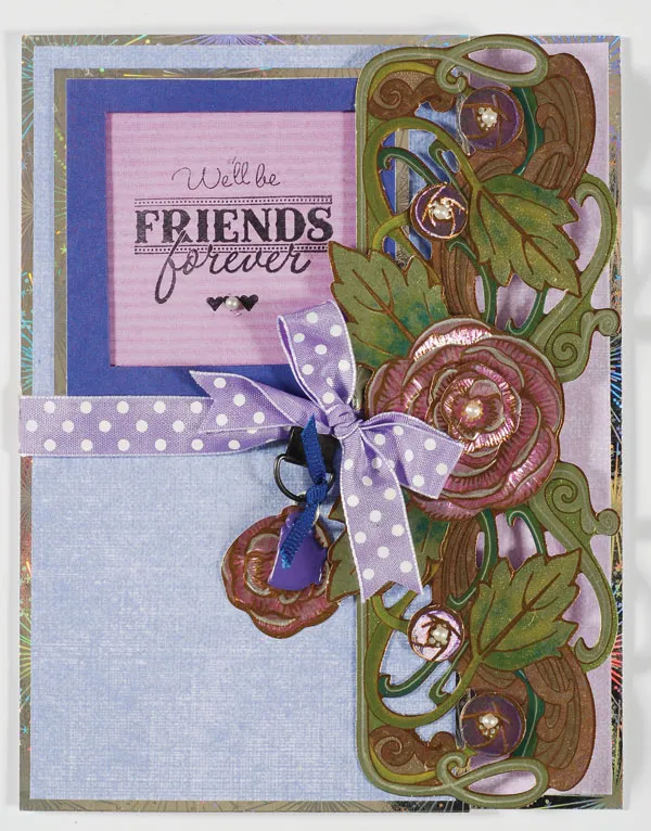 Cut 2½"x2½" purple striped paper and stamp “we’ll always be friends” and three hearts in the center. Glue centered behind the frame, then mat on silver paper with 1/8" borders. Glue to the front, ¼" from the top, slipping it under the ribbon.