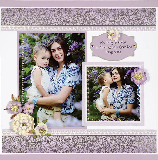 Journaling: Write or print on lavender cardstock and trace with Design Tool Kit #1 Squared Oval shape. Ink shape with metallic silver ink and glue above the 4” photo. Place Purple Jewel Dazzles™ on each side of the shape. Place self-adhesive lavender blossoms on the page as shown.