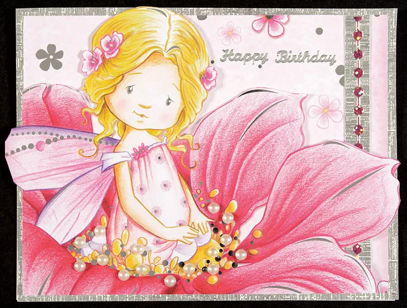 Cut out the Pink Fairy, trimming ¾” from the bottom of the flower and 3/8” from the left edge, bumping out the wing as shown. Foam tape the Fairy cut-out to the card front as shown. Place pearls on the flower and Silver Tiny Words & Phrases Dazzles™ “Happy Birthday” on the top right.
