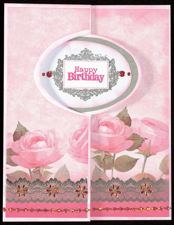 Card front: Fold the card as directed in the instructions. Use the included patterns to cut pieces for the left and right panels from rose border paper, keeping the roses along the bottom edge. Cut the spine piece from Hammered Silver paper. Glue these in place.