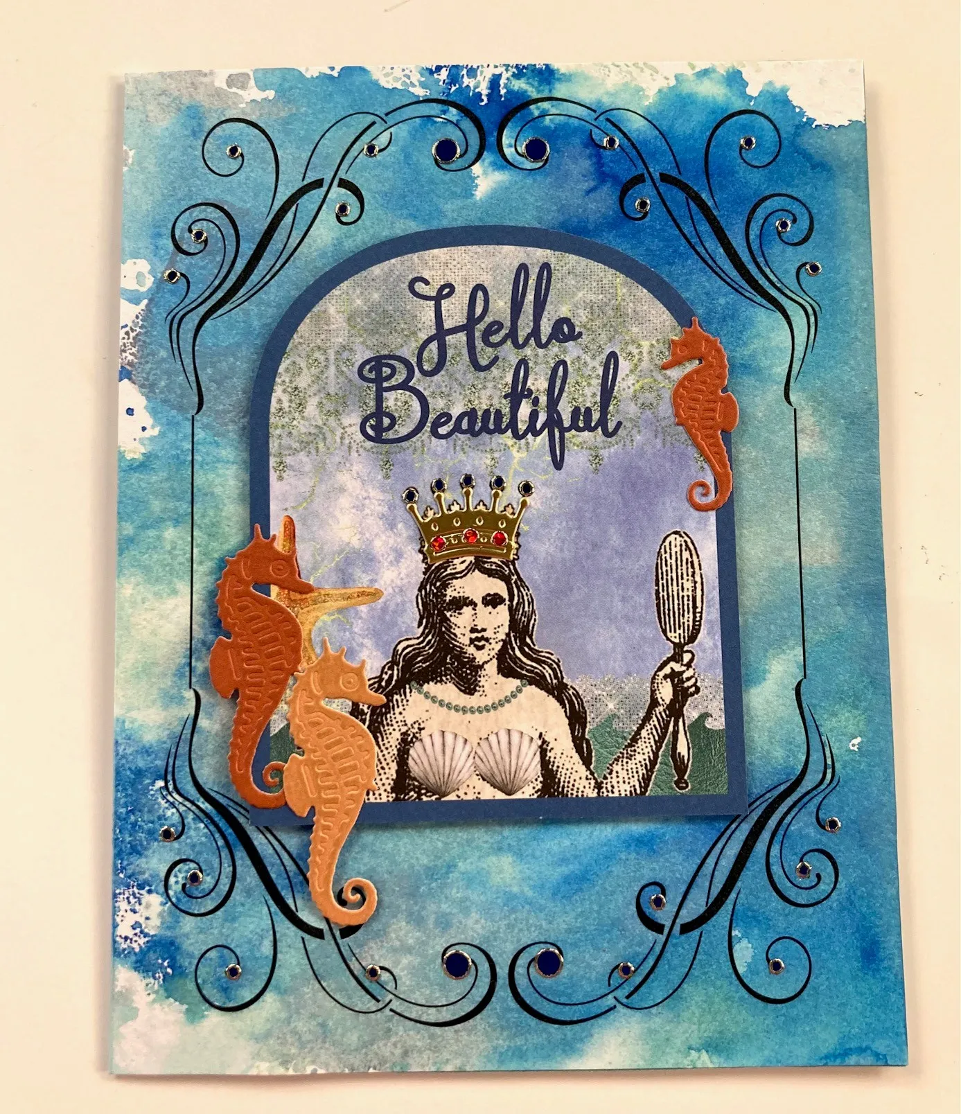 6. Mat the “keep calm…” cutout on Gold cardstock with very narrow borders then glue it at the upper left as shown. Die cut the mermaid and crown from Gold cardstock, then glue her to the inside holding the crown in her hand as shown. Die cut a large tan cardstock seahorse, rub it with Greige ink and glue it at the lower left. Place blue jewel Dazzles™ on the crown.