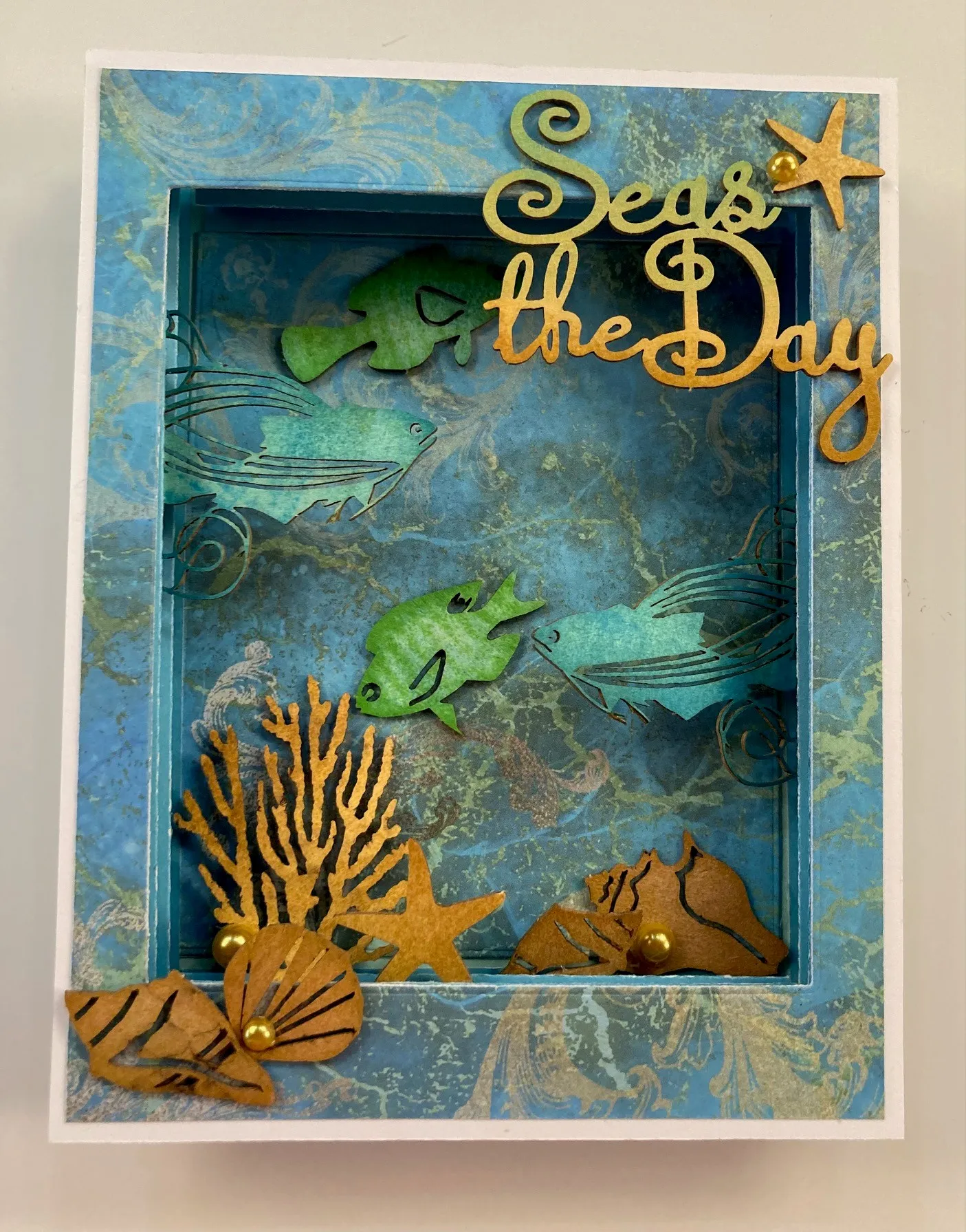 6. Glue the large shell and small fish to the backing. Glue the two shells shown on the lower left front. Glue the words and small starfish to the upper right front. Glue the remaining chipboard shapes to the accordion-folded sections on the sides and bottom as shown. Place four gold pearls on the shells as shown.