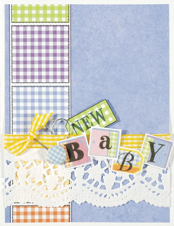 Cut out the 1 3/8" gingham tag and computer-print “new” on it. Glue it tucked behind the ribbon and clip. Mat “b-a-b-y” stickers on white cardstock, each with 1/32" borders, then foam tape to the front as shown.