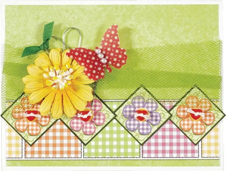 Cut out four gingham flower squares and glue across the border as shown. Glue the large paper flower over the tied tulle. Attach a flat pinz to the tulle, just right of the flower and glue a butterfly to the pinz top. Tie a 3" green ribbon to a heart clip, trim the ends, and glue the clip extending upward behind the flower. Place a red button on each flower square, then glue knotted thread to each button.