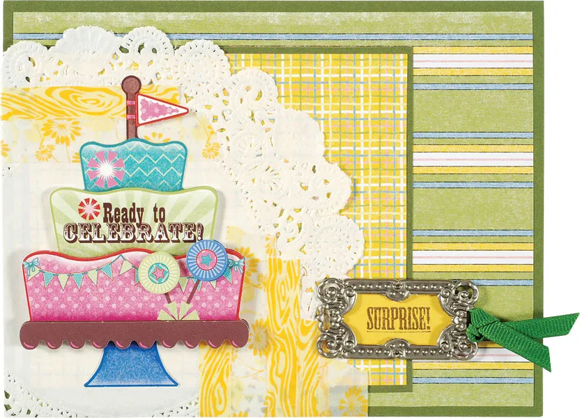 Assemble the cake papier tole piece, following package directions and placing foam tape between the layers. Glue to the doily. Stamp “surprise” on yellow paper and cut to fit behind the silver frame. Glue to the frame, then attach a 3½" green ribbon to the right end. Glue at the lower right.