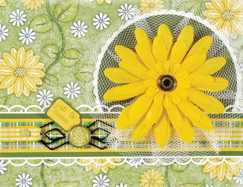 Cut an 18" tulle length, then trim to 2" wide. Use the needle and thread to sew a running stitch along one long edge. Pull the thread to gather the tulle into a circle and knot to secure. Stack a 1¼" yellow flower on a 2¼" yellow flower, then stack both on a 3½" yellow flower. Place all three on the tulle circle and secure with a green rhinestone brad. Glue to the green circle. Punch a small yellow tag and stamp “just because” and a tiny heart on it. Mat on dark green paper with 1/32" borders, then glue extending from under the wide brad.