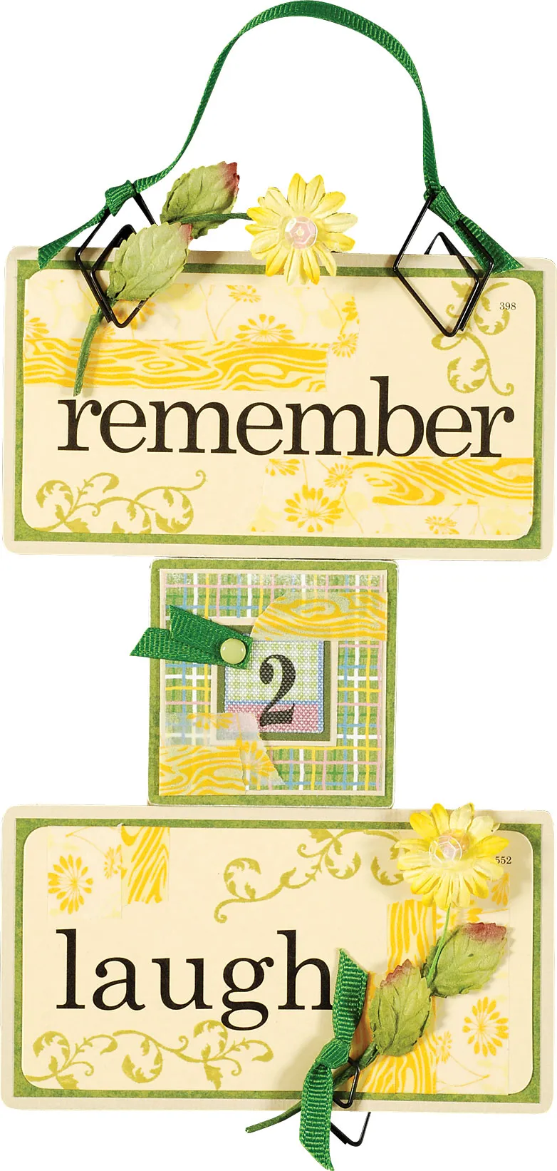 Mat the panel on dark green paper with 1/16" borders, then on tan cardstock with 1/8" borders. Round the tan corners with the 1/8" punch. Tie each end of a 7½" green ribbon onto a diamond clip to make a hanger, then attach the clips to the upper edge as shown. Slip a flower under the left clip, angled right. Turn the panel over and secure the clips with fastener halves as in step Cut two thin strips of fastener material and place one over each flower stem to secure it to the panel, then hide the fastener with a leaf.