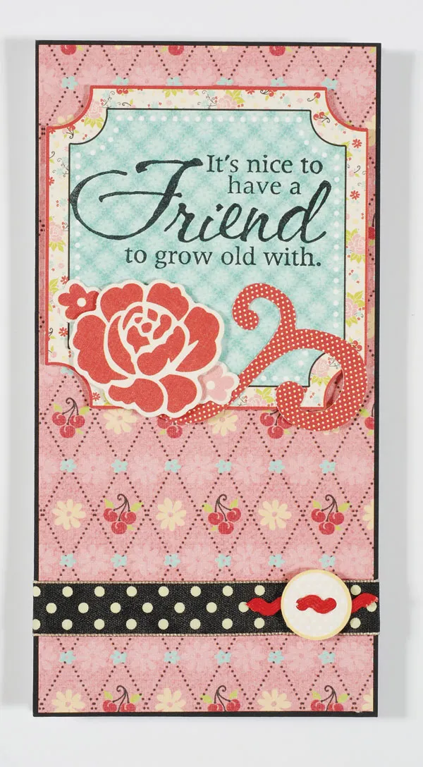 Wrap black polka dot ribbon ¾" from the bottom and glue the ends to the back. Glue the constructed front to the first panel. Punch out the inner frame die-cut and remove the nibs. Stamp “it’s nice to have a friend to grow old with” near the top, then foam tape to the upper front.