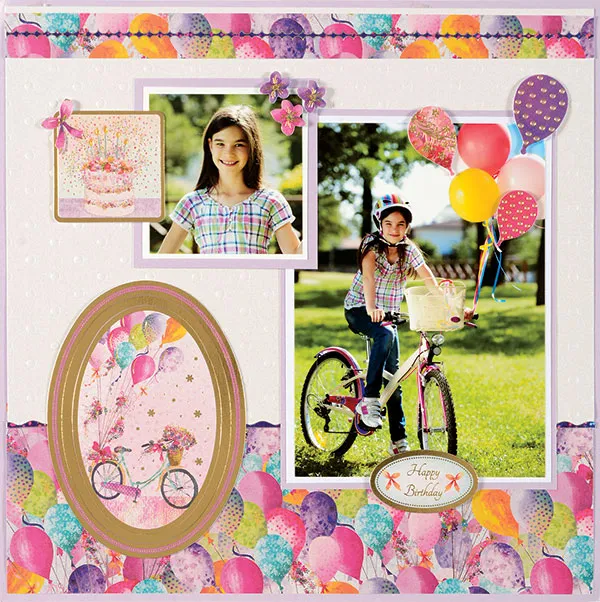 Separate the large oval frame from the bike oval from the Floating and Fluttering die-cut sheet. Glue the frame to the left side of the page border and foam tape the oval inside the frame. Foam tape the “Happy Birthday” oval below the large photo and the balloons and flowers from the Fly Your Kite die-cut sheet as shown. Foam tape the birthday cake square and bow to the left side of the small photo.
