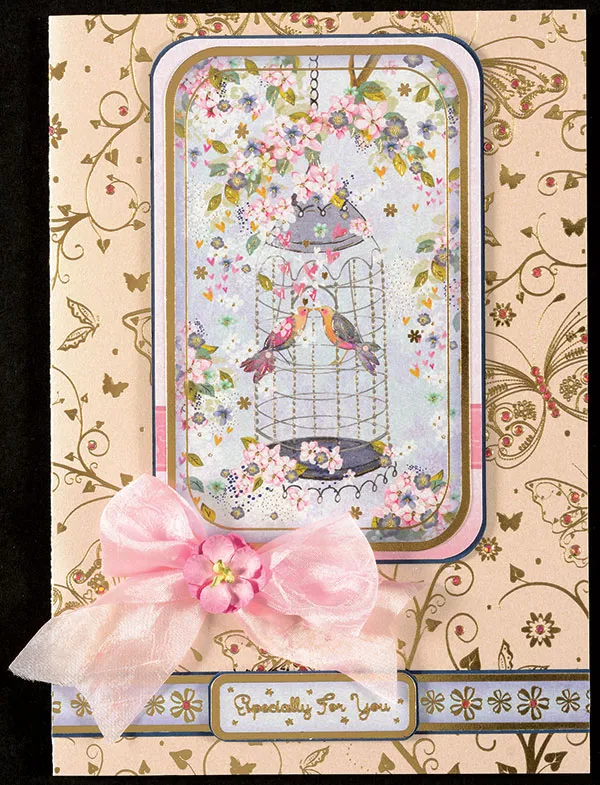 Embellish the butterflies on the tan foiled cardstock card base (front and back), and the light blue flower border with Pink Jewel Dazzles™. Use 1 1/2" wide pink crepe ribbon to tie a bow. Trim the ends into a “V” and Zot™ the bow on the lower left corner of the birds/cage die-cut as shown. Add a small flower on the center of the bow.