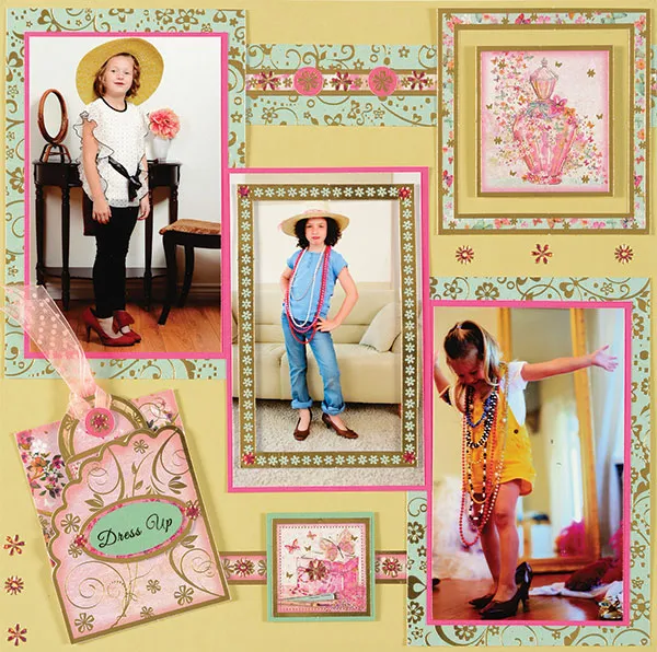 Trim each photo into 3½”x5¾". Mat on bright pink cardstock leaving 1/8” borders. Mat two photos again on green flower foiled paper leaving 3/8” borders. Glue to the top left and bottom right corners, and leave a small space on each to slip the borders under. Glue the last photo centered in the middle, overlapping the other two photos. Foam tape the green flower frame over the picture.