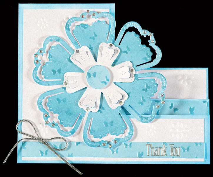 Glue the layered flower near the center of the card. Place “Thank You” Tiny Words & Phrases Dazzles™ near the bottom right. Use silver cording to tie a bow and Zot™ on the left side as shown. Embellish the die-cut flower with Silver Jewel Dazzles™.