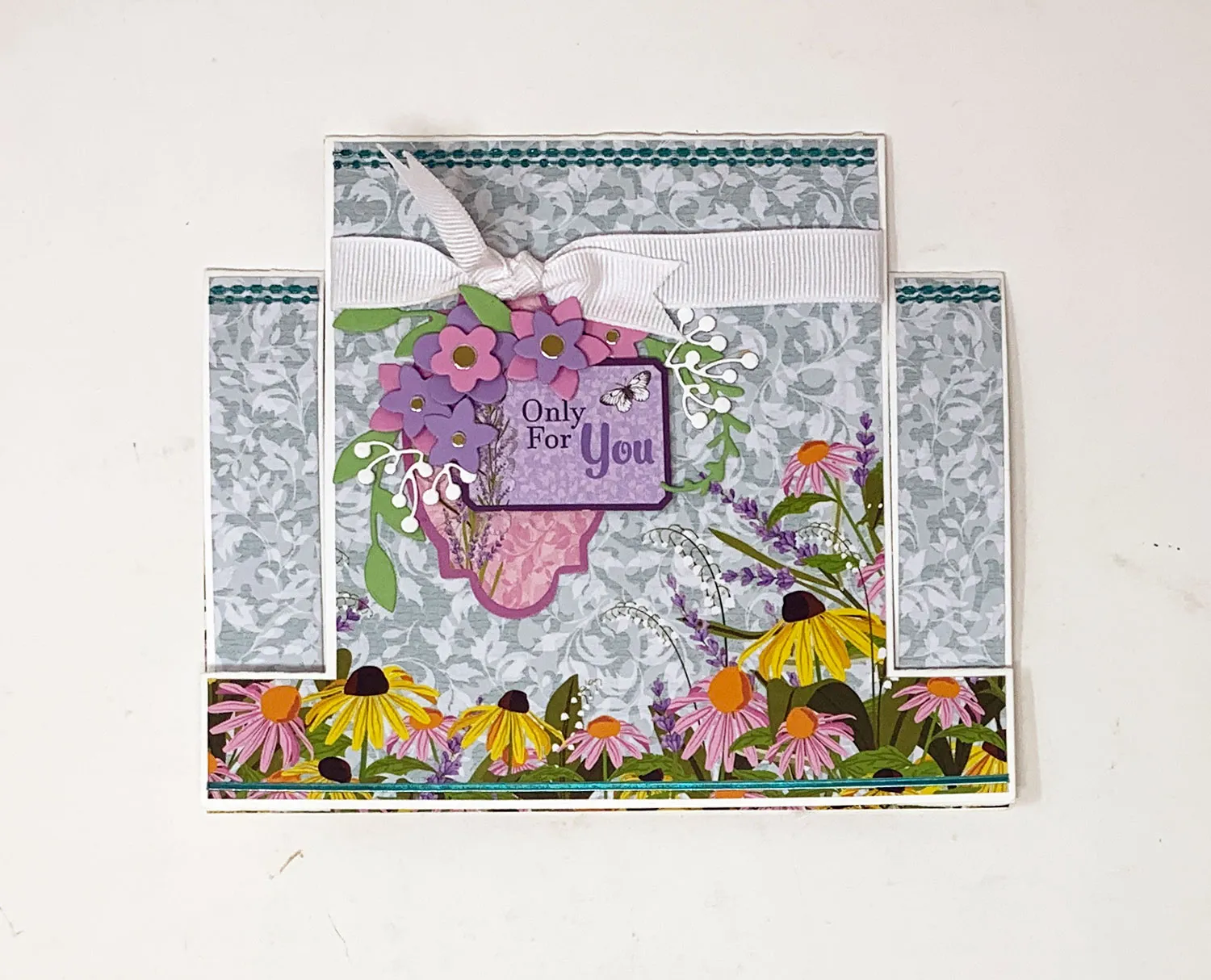Punch out the Secret Garden pink blank label and cut out the “only for you” label. Glue the pink label extending from under the ribbon knot and foam tape the greeting extending off the right edge of it.