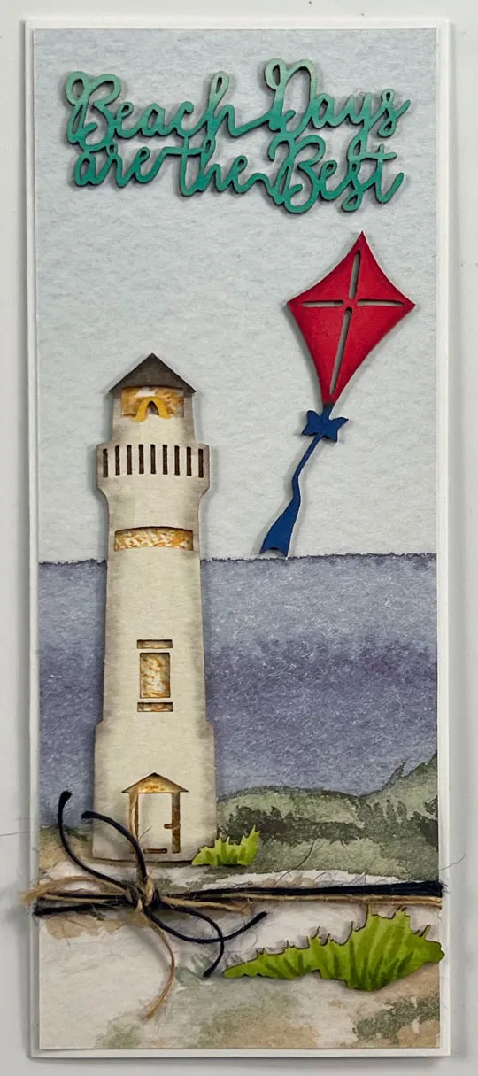 3. Use markers to color the lighthouse, kite, and “beach days are the best” chipboard pieces. Color two of the waves chipboard pieces green to make them into grass. Glue lighthouse to the At The Shore golden sand cardstock and trim along the edges. Glue the chipboard pieces to the front as shown, foam taping the smallest grass piece at the base of the lighthouse.