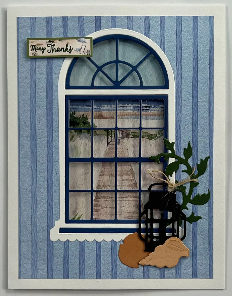 2. Die cut just the outer frame from acetate, then glue it over the window opening. Glue the white frame in place. Die cut the arched and rectangular grids from At The Shore navy cardstock and use Sticky Specks™ to attach them inside the window. Foam tape the At The Shore “many thanks” label at the upper left.