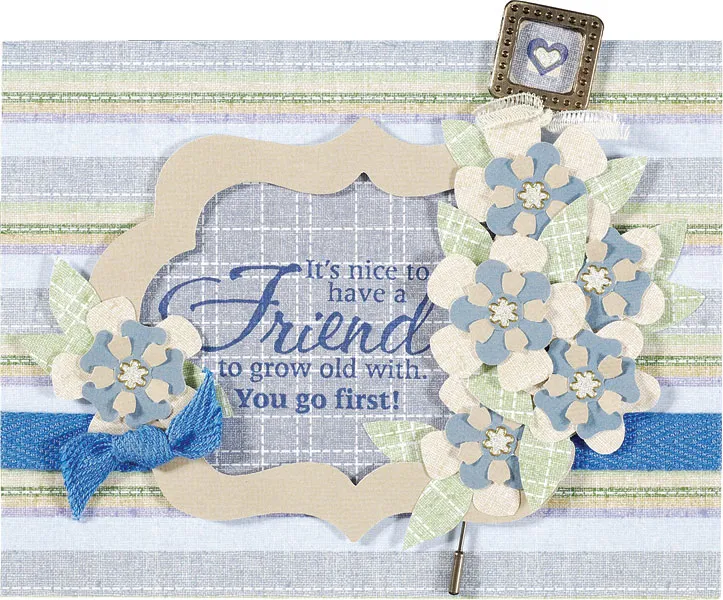 Punch six petite petals from tan cardstock. Punch three of each style of the petal pairs from blue cardstock. Assemble the flowers following package directions, then glue one to each tan linen flower. Glue and foam tape five flowers over the right end of the frame, then glue 10 leaves among them. Glue one flower and three leaves to the frame at the left. Knot a 3" twill and glue below the left flower. Place Dazzles™ flowers and a heart as shown.