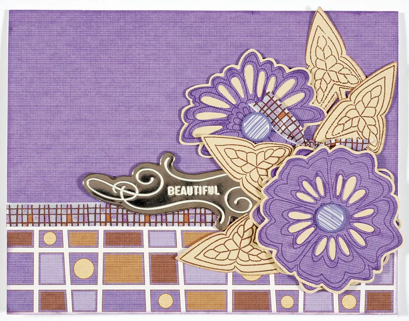 Stamp the leaf four times with Brown on tan cardstock, then die cut (see tip, above). Ink the edges with Brown. Stamp the large flower twice and the small flower once with Wisteria on purple textured paper then die cut. Ink the edges of each flower with Wisteria, then mat on tan cardstock with 1/32" borders.