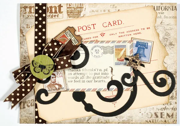 Cut out a ticket, the envelope, and two stamps and ink the edges. Stamp the “thanks” definition on the envelope near the bottom. Die cut two small and one large swirl from black cardstock. Glue the large swirl and envelope as shown, then glue a small swirl extending from the ribbon.