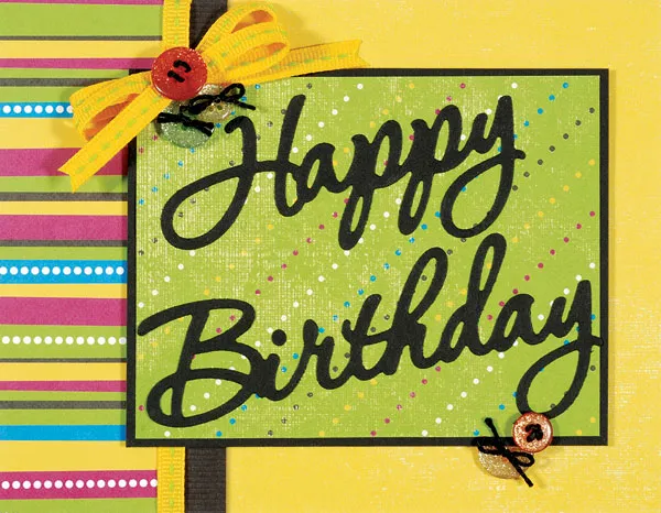 Cut 4½"x3½" lime dotted paper and mat on black cardstock with 1/16" borders. Die cut “happy” and “birthday” from black cardstock and glue angled across the lime paper. Foam tape the greeting to the front, ½" from the right edge.