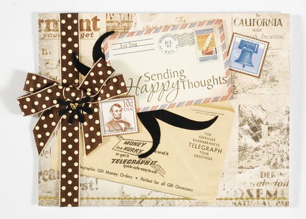 Cut out the envelope, and two stamps and ink the edges. Use the template to trace and cut out a large bracket shape and a small swirl. Cut in half. Stamp “Sending Happy Thoughts” on the envelope near the bottom and glue at an angle over the suede shapes. Glue one stamp as shown, and foam tape the Lincoln stamp.