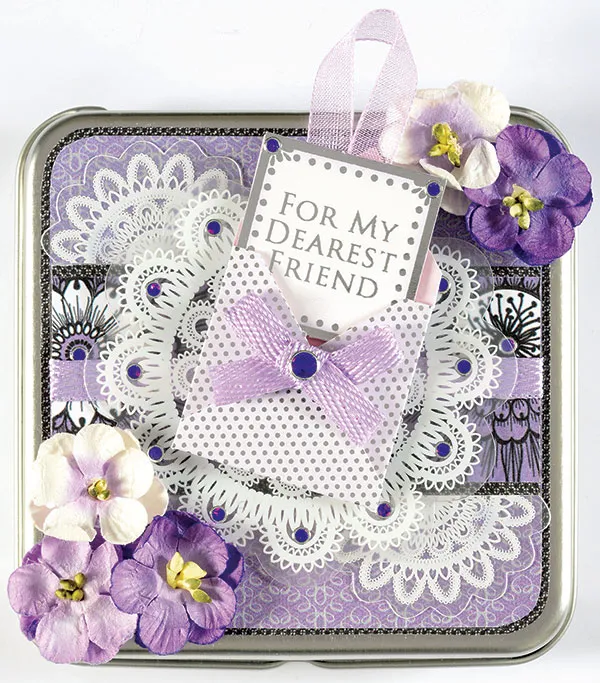 Open your tin and use Ultra Tape to place the saved purple floral paper on the inside. Place Jewel Dazzles™ on the flower centers of the paper. Foam tape a large doily centered on the paper.