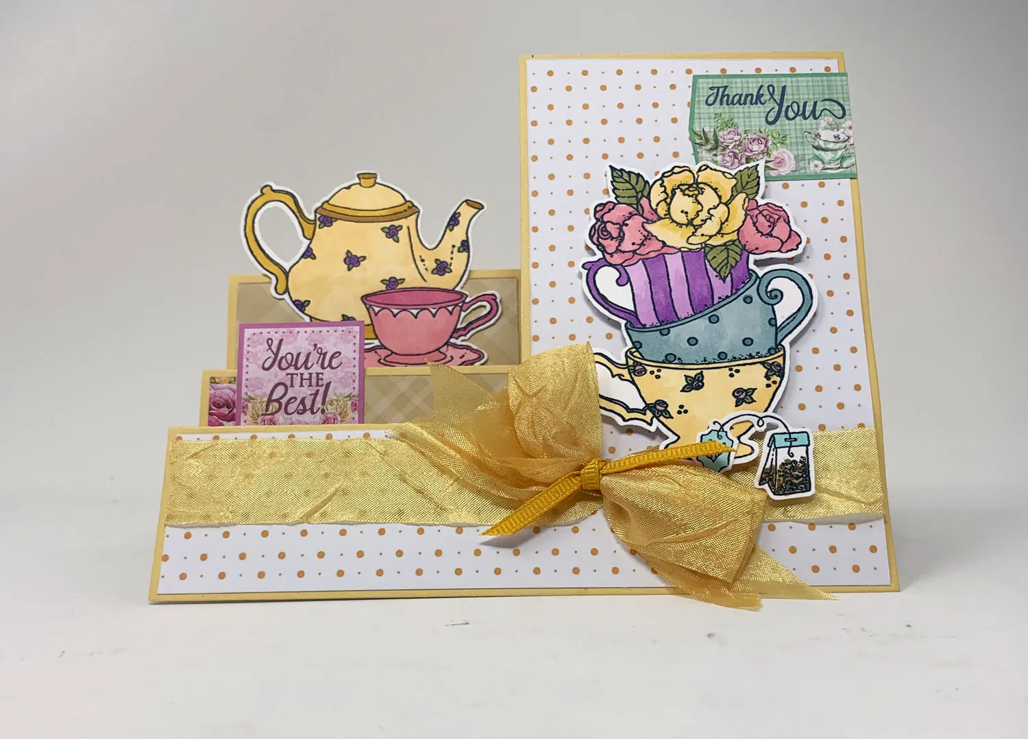 Stamp the teacups, teapot and teabag onto the white cardstock. Color the images with the Tri-Blend markers, then cut out the images. Glue the teapot to the back step, extending 1 1/8" above the fold. Foam tape the teacups and teabag to the right front, overlapping the ribbon as shown.