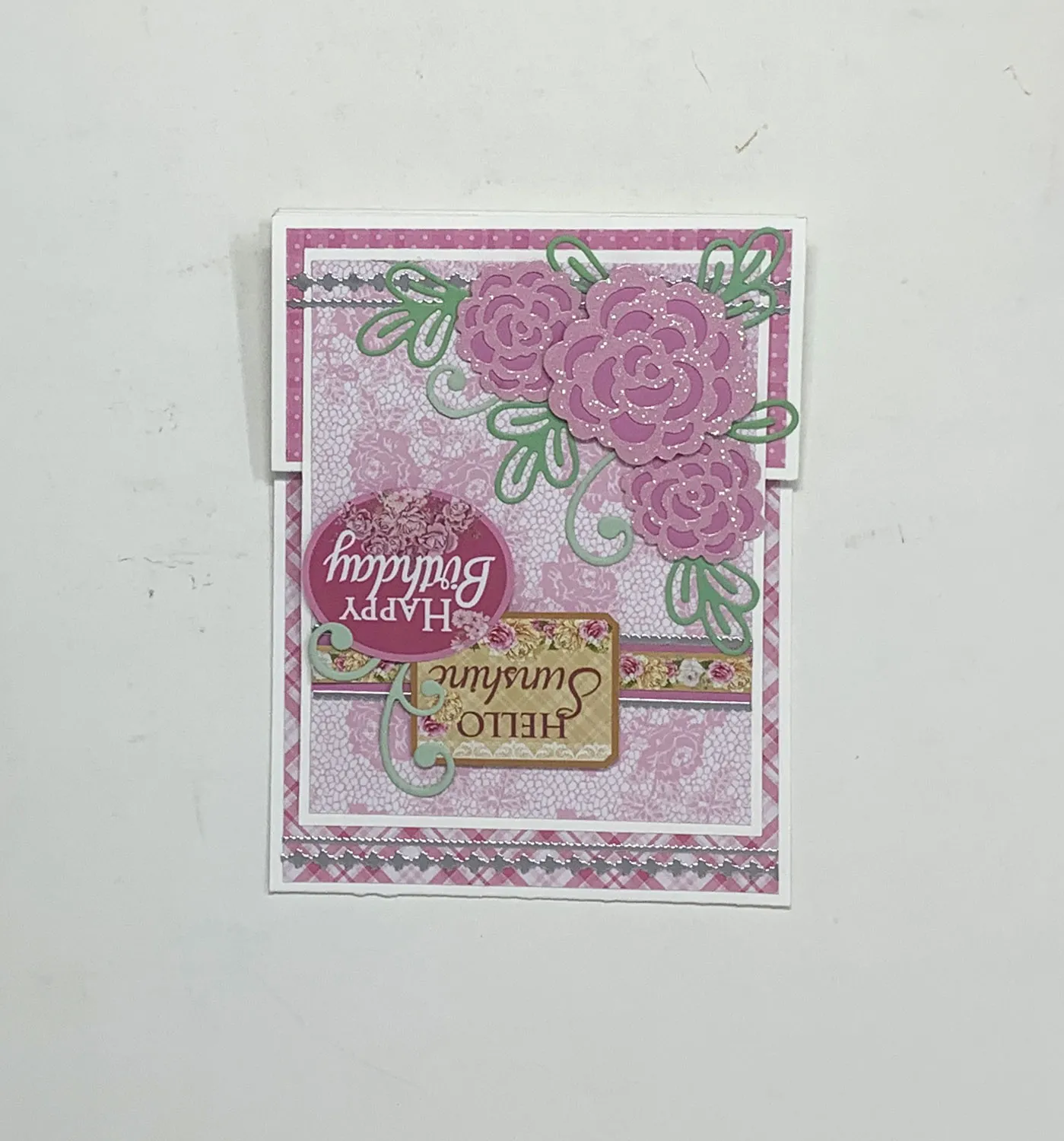 Cut out the Teacups & Roses floral border cutout and mat it on pink cardstock with narrow borders. Glue it to the front panel, 1" from the top, then place a silver thin line Dazzles™ above and one below the border, trimming the excess. Cut out the Teacups & Roses “hello sunshine” and “happy birthday” labels and foam tape them to the front as shown.