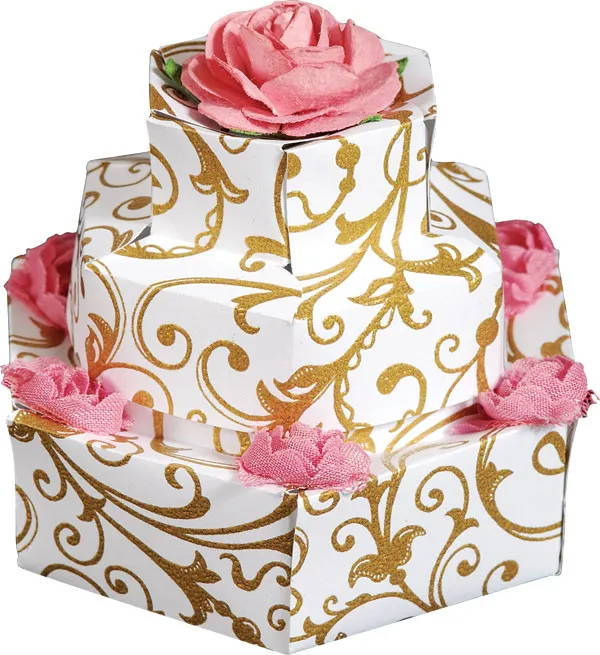 Follow the instructions to make a cake base and topper from gold swirls paper. To glue the tabs, use a small piece of the Ultra Tape on each tab.